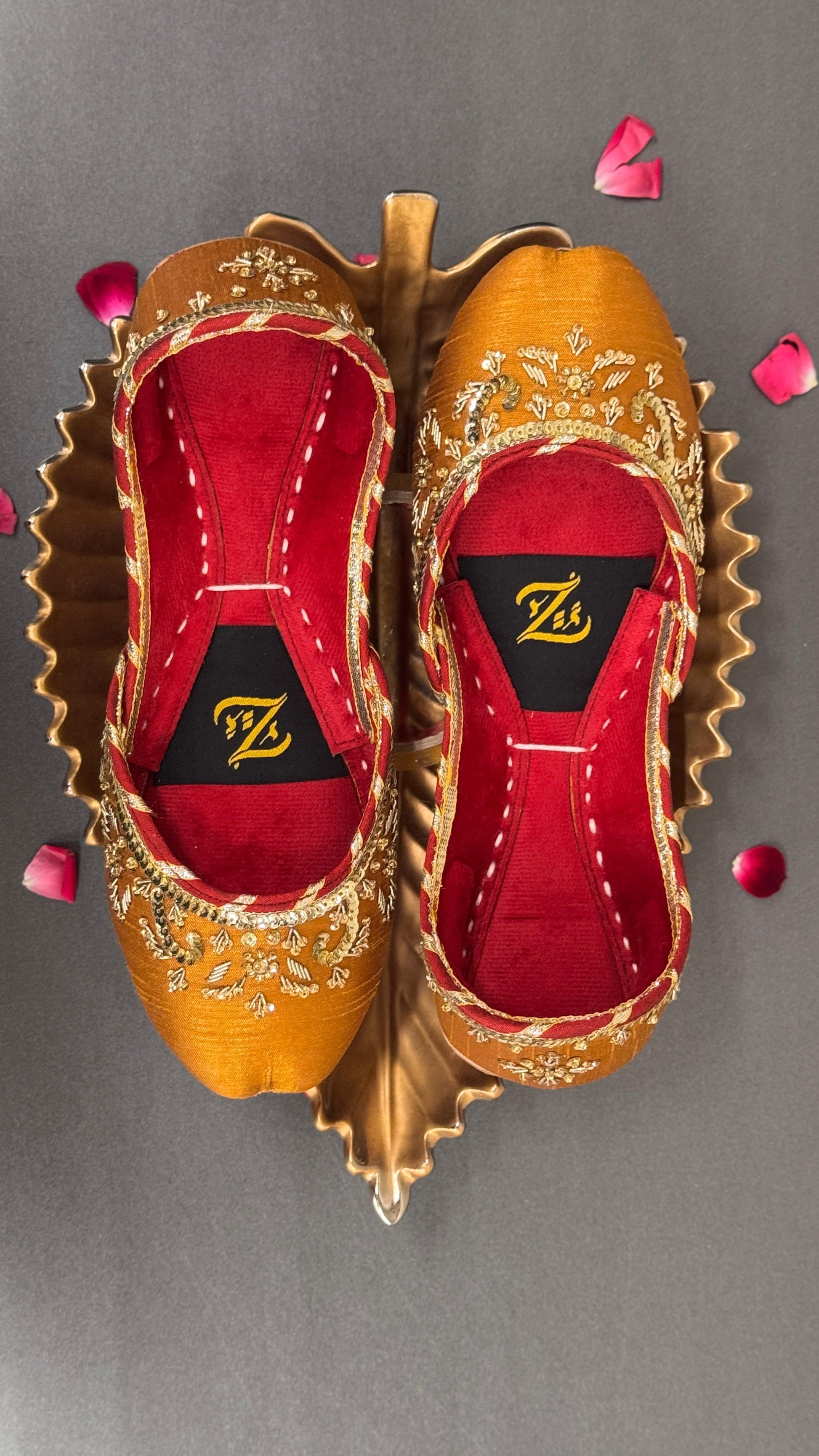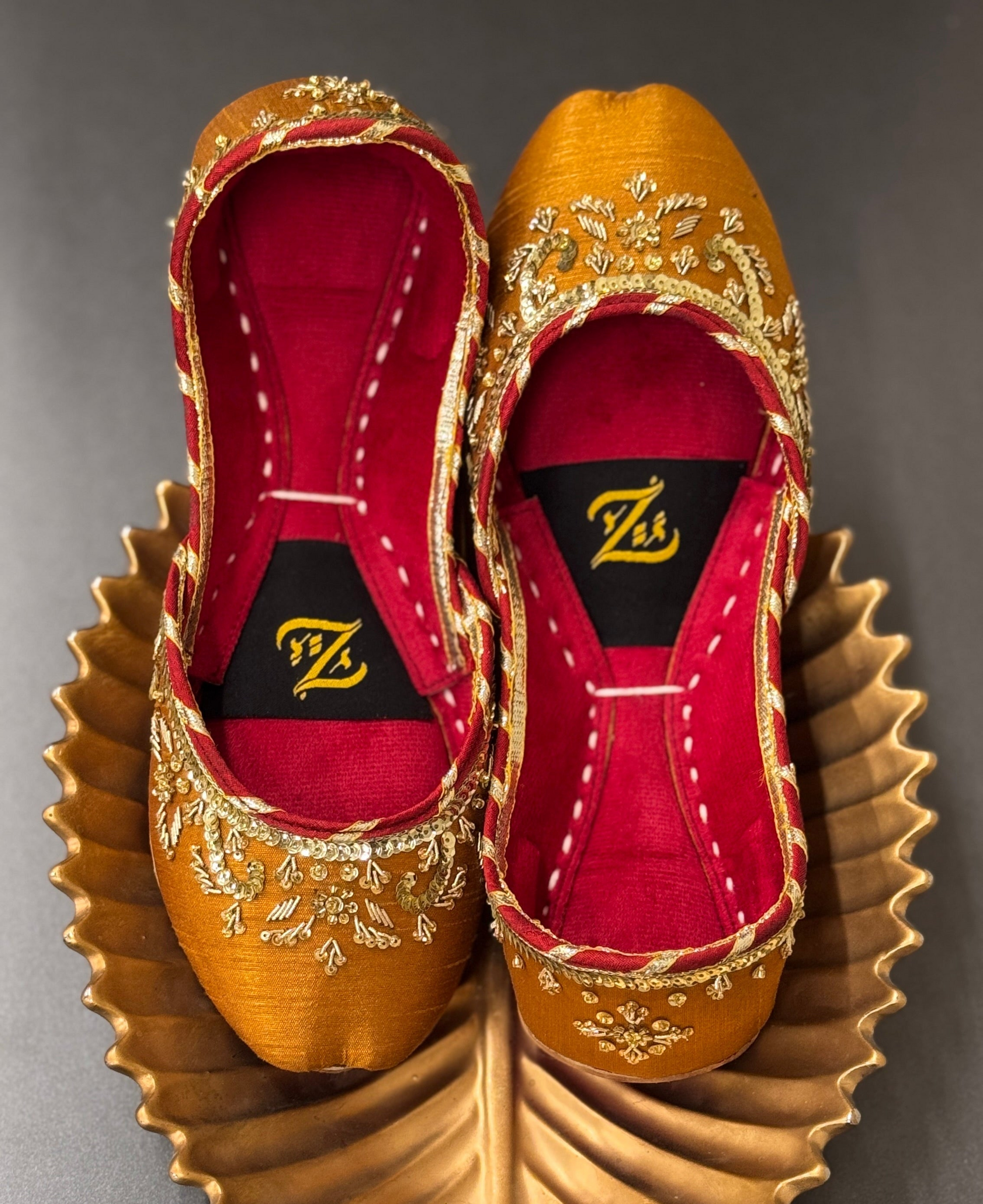 Kiran is embellished with elaborate golden embroidery, these khussas are adorned with glittering sequins, intricate beading, and striking floral designs. The intricate work on the back is a special treat for the ones who love Tradition. kiran combines classic design with unparalleled comfort, making them ideal for weddings and other celebratory events.