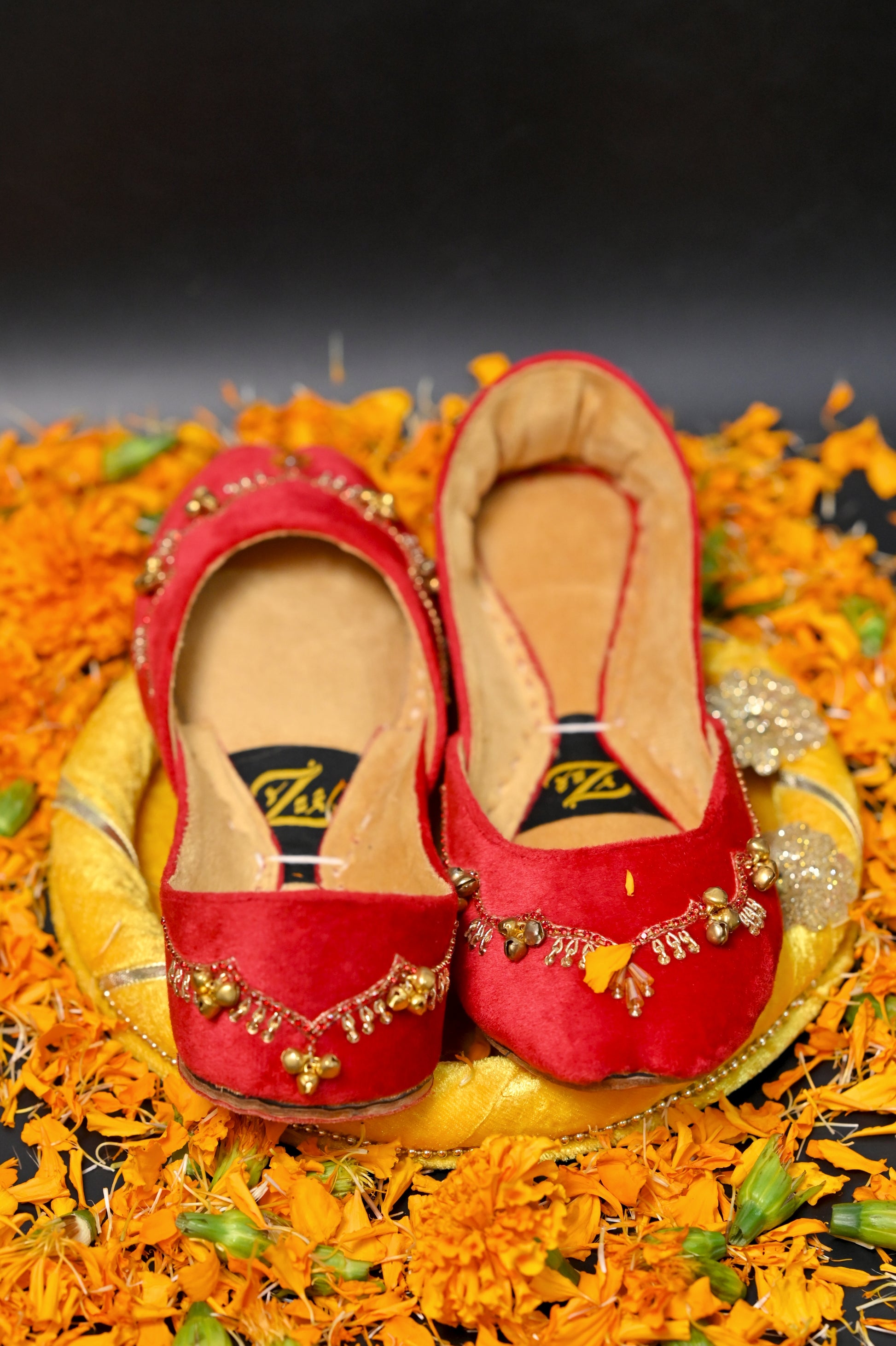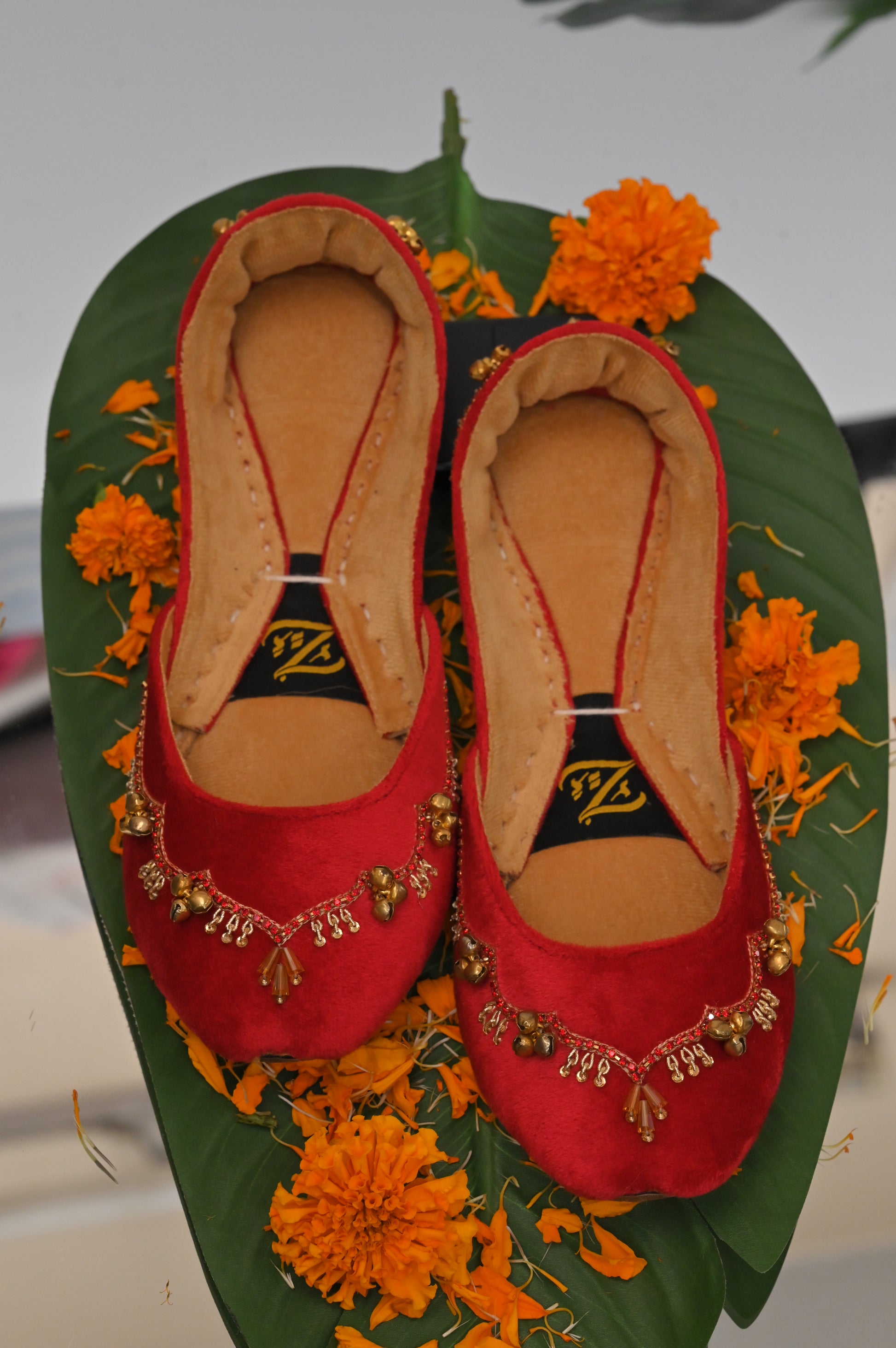 Step into timeless elegance with our handcrafted red velvet khussa, adorned with delicate ghungrooz that add a soft, melodious charm to every step. The deep velvet hue symbolizes love and celebration, making it the perfect choice for festive occasions, weddings or evenings when you want your style to speak of tradition with a modern touch. Designed with comfort and craftsmanship at its heart, this piece blends luxury with heritage.