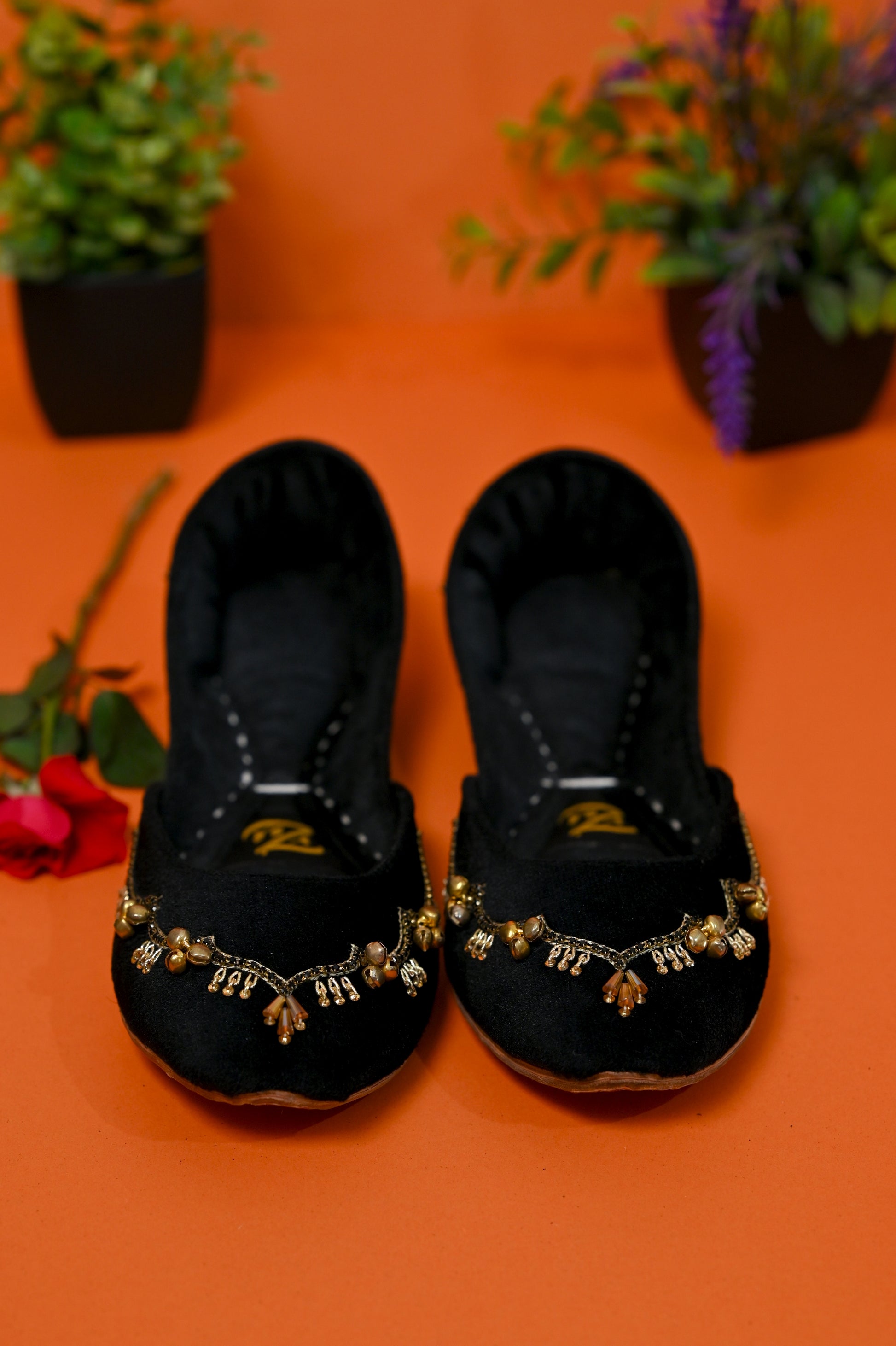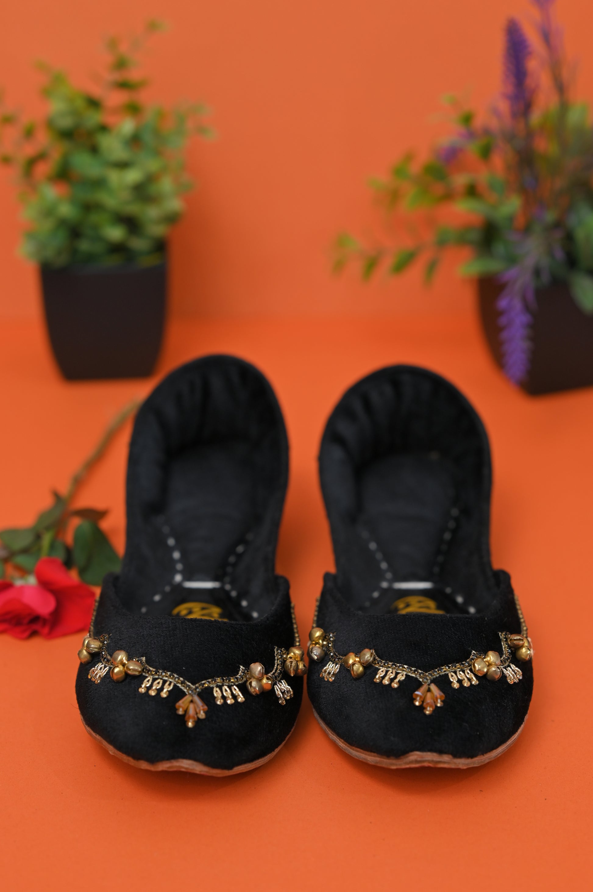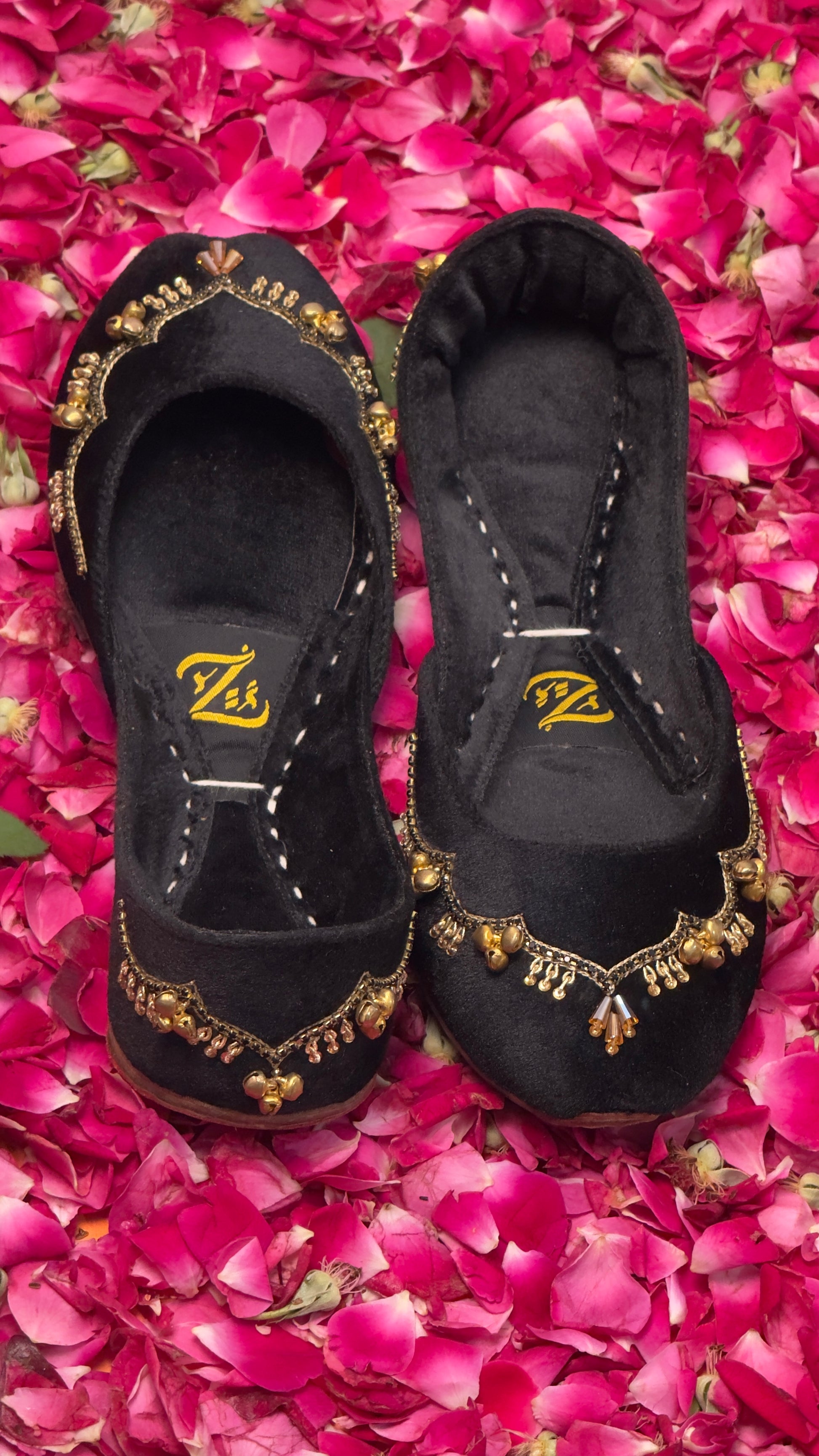 Step into timeless elegance with our handcrafted Black velvet khussa, adorned with delicate ghungrooz that add a soft, melodious charm to every step. The deep velvet hue symbolizes love and celebration, making it the perfect choice for festive occasions, weddings, or evenings when you want your style to speak of tradition with a modern touch. Designed with comfort and craftsmanship at its heart, this piece blends luxury with heritag.
